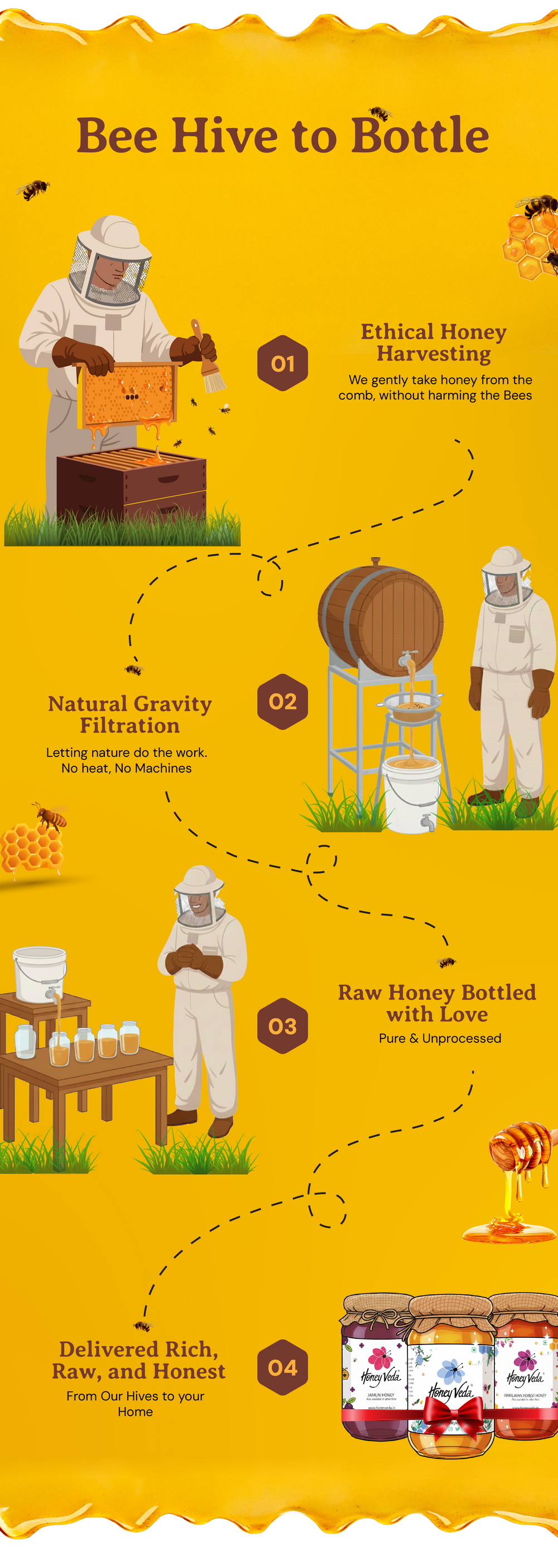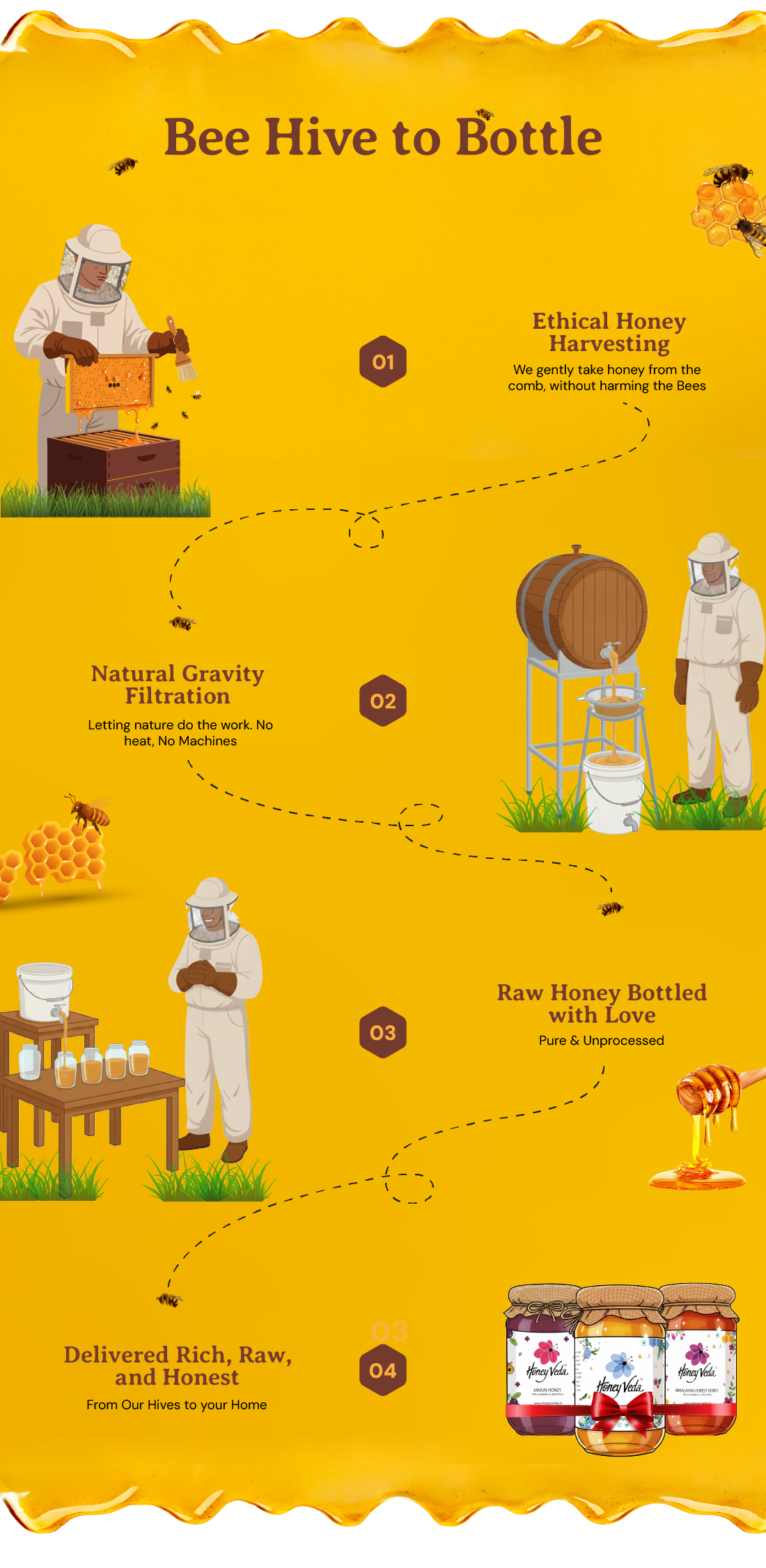 At HoneyVeda, we’ve built a unique bee ecosystem across 7 Indian states, working with 1000+ farmers and certified bee experts who believe in cruelty-free, natural beekeeping.