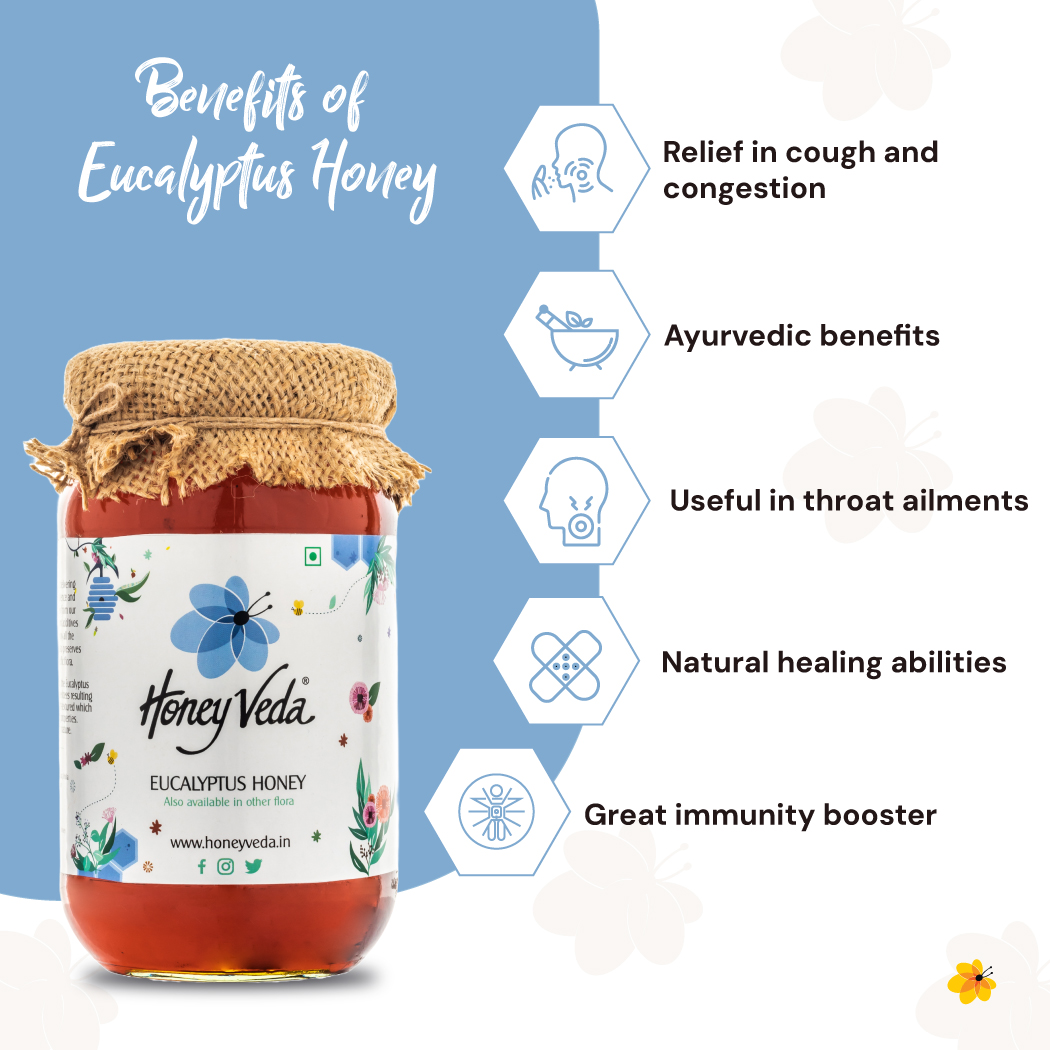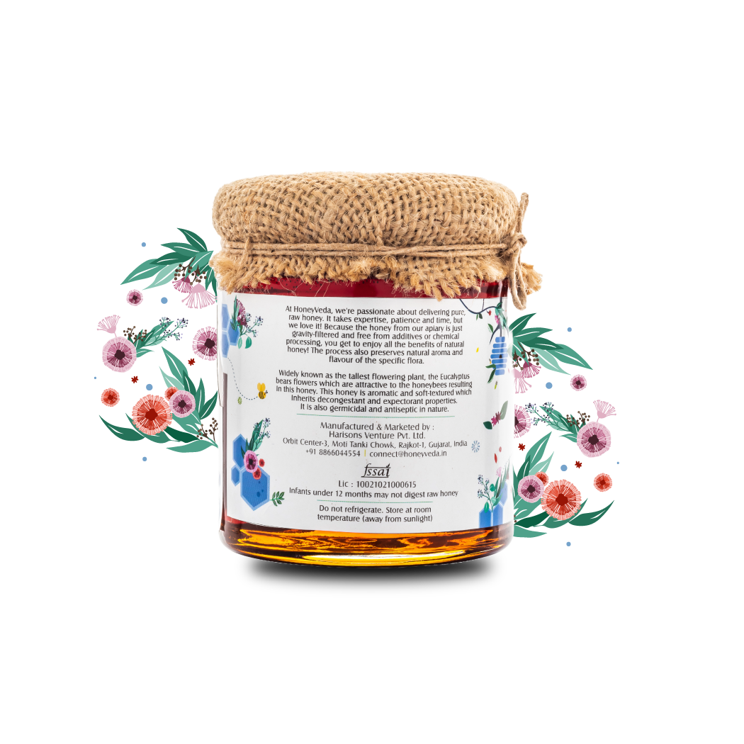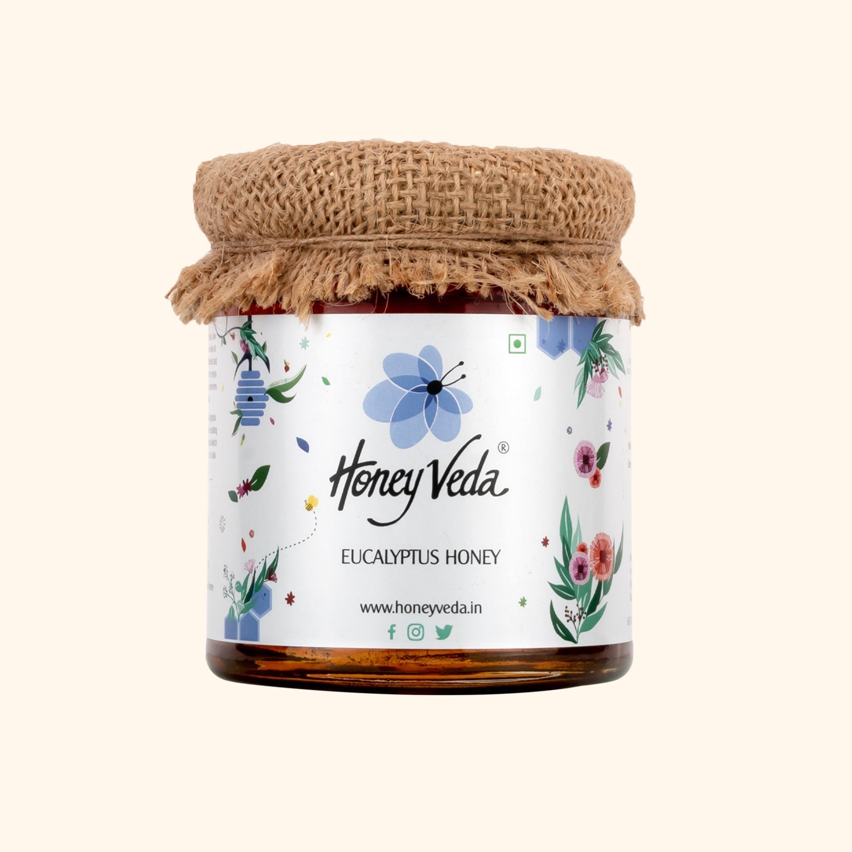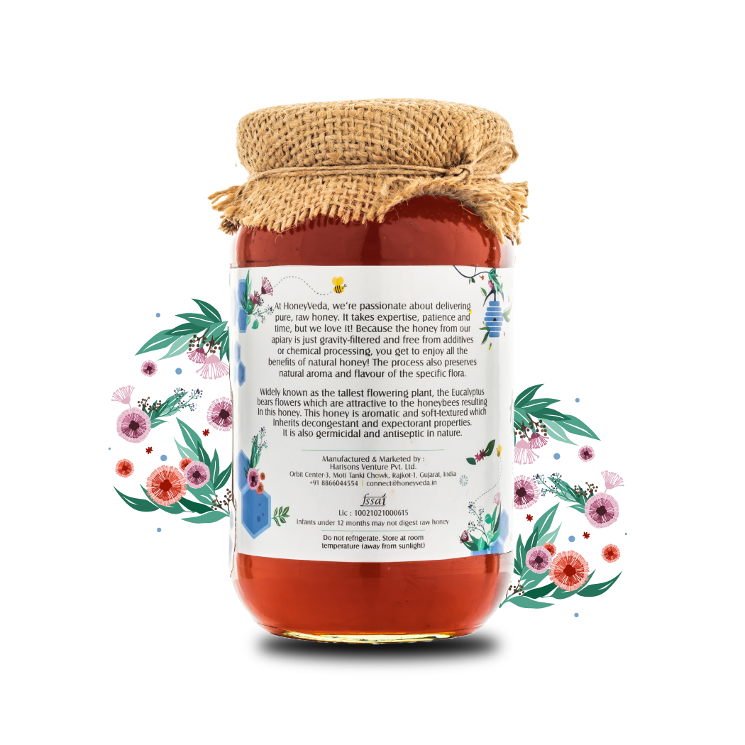 Eucalyptus Honey is made by honeybees from the nectar of the Eucalyptus tree commonly known as Nilgiri. It is aromatic, soft-textured honey which has a light amber colour with a woody warm touch. It has a medium to strong taste intensity that combines with slightly mentholated and moderate sweetness.
