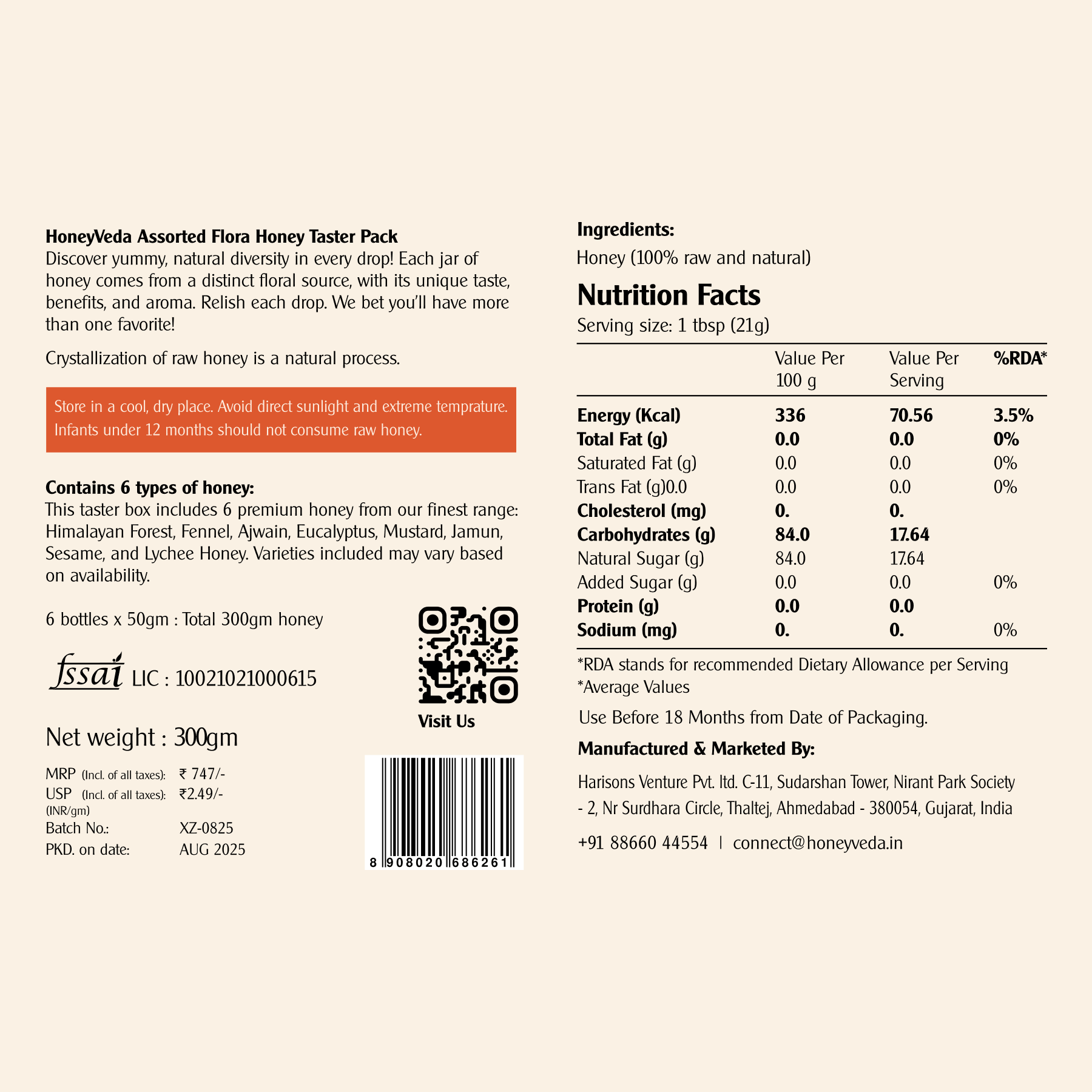 | Expiry | Raw Honey Doesn’t Expire. As per FSSAI guidelines, we have to mention expiry date 18 months from packaging. |
